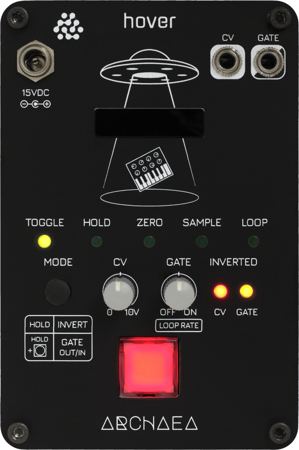 The looper function includes a playback rate, allowing you to record hand movements, loop them, and play them back at different speeds. The CV output can be scaled between 0V and 10V. The 5V gate output can be triggered when the hand passes a configurable threshold. Both the CV and gate outputs can be inverted independently. The gate can also be set as an input to trigger the button function or restart the loop from an external trigger source, such as a sequencer. The restart and rate control features allow modulation loops created with Hover to be perfectly in sync with the music.